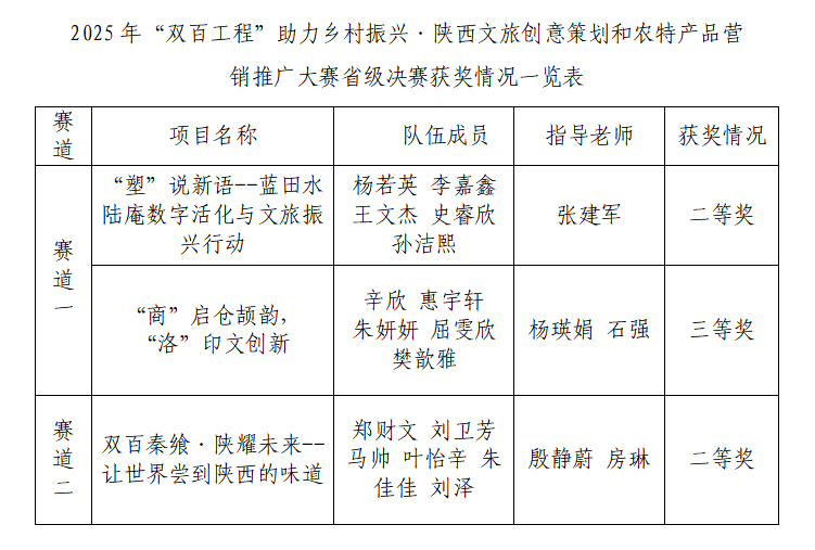 11月29日,由陜西省委教育工委主辦的2025年“雙百工程”助力鄉村振興·陜西文旅創意策劃和農特產品營銷推廣大賽省級決賽在西北政法大學長安校區舉辦。我校選派的3支參賽團隊在激烈角逐中脫穎而出,最終榮獲二等獎2項、三等獎1項,充分展現了學校在服務鄉村振興戰略中的顯著成效。