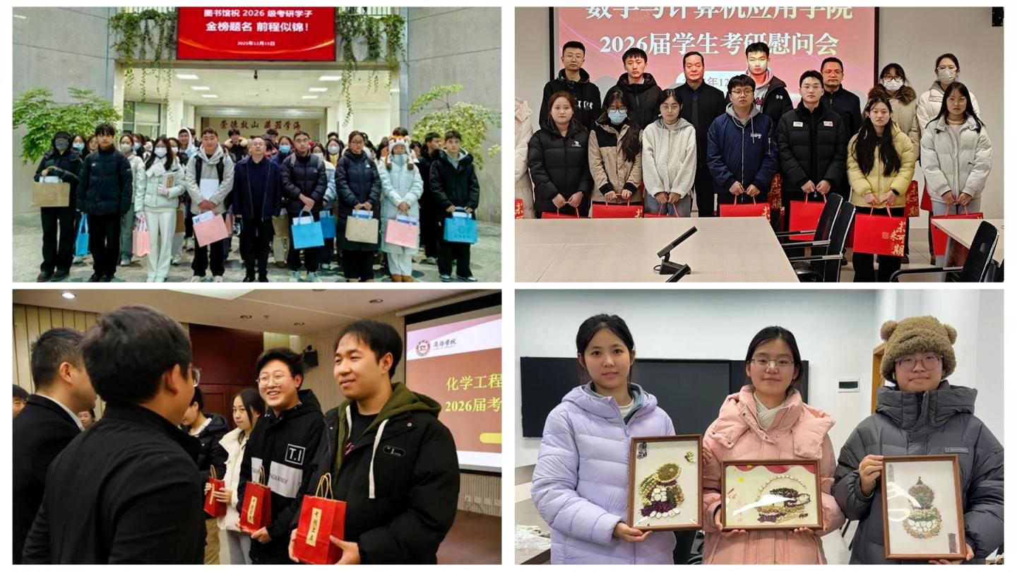 各學院在緊張的備考期間,格外注重對學生的人文關懷與情感陪伴。人文學院、數計學院、健康管理學院、教育科學學院紛紛召開考研慰問座談會、加油鼓勁會。學院黨政領導、系主任、輔導員與學子深入交流,細致詢問備考狀態與需求,并結合自身經歷給予復習策略、心態調節等實用建議。電信學院領導及老師們走進考研自習室,與學子面對面交流,送去慰問的同時給予貼心支持。