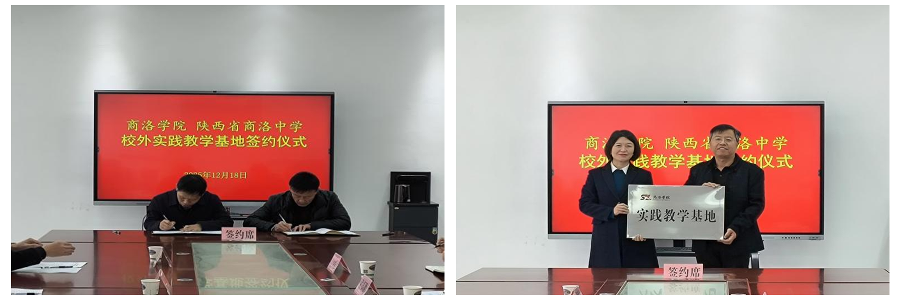 當天上午,“商洛學院與陜西省商洛中學校外實踐教學基地”簽約暨授牌儀式在商洛中學舉行。商洛中學教務處主任劉丹軍與商洛學院人文學院院長張文諾共同簽署合作協議。商洛學院教務處處長王怡與商洛中學副校長武高鵬為基地揭牌,并向商洛中學贈送教育教學類書籍。