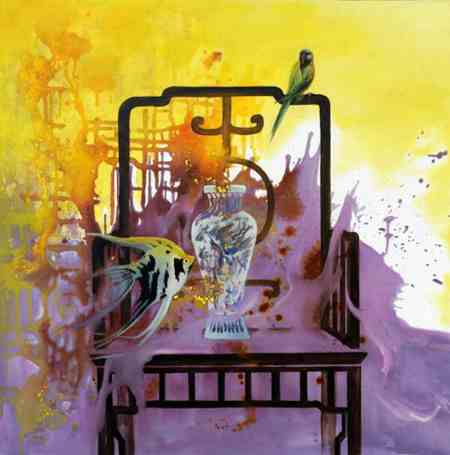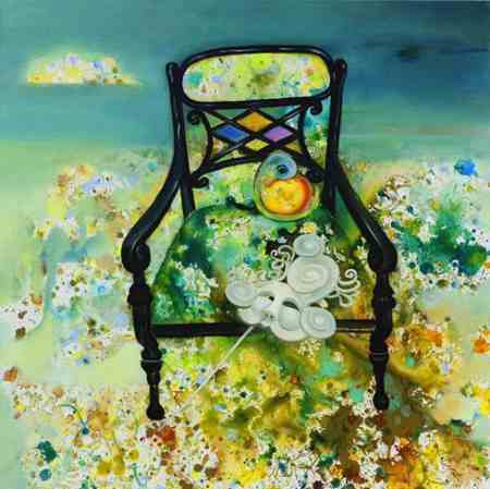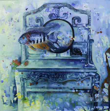 楊靜的作品兼具油畫的西方特質與藝術家個人的東方屬性,多以意象風景為主,魚、飛鳥、椅子、面具、鮮花常常成為畫面中的主要視覺符號,意象化的表述方式是其繪畫語言特點,獨具視覺張力的畫面背后蘊藏著或浪漫或神秘或抒情的藝術獨白。《飛翔的魚》系列作品承載著對“自然”“生命”“自由”的渴望與理想,“飛翔的魚”穿梭于人間百象,描繪著在經歷世事滄桑之后一顆滿懷“游”“逸”的心。作品把中國傳統文化中對莊子美學的研究與領悟融入到西方油畫的創新當中,在中西文化的對撞中融匯出的獨特浪漫氣質是楊靜油畫藝術走出國門并被認可的實質。