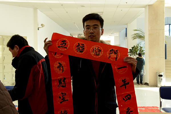 活動(dòng)現(xiàn)場(chǎng),“五湖四海皆春色 萬(wàn)水千山盡得輝”、“和順一門(mén)有百福 平安二字值千金” 、“綠竹別其三分景 紅梅正報(bào)萬(wàn)家春”、“壯麗山河多異彩 文明國(guó)度遍高風(fēng)”……一張張紅紙上寫(xiě)滿了新春的祝福語(yǔ)。師生們圍繞在書(shū)法家周圍選擇自己心儀的祝福話語(yǔ),書(shū)法家們揮毫潑墨,一一滿足廣大師生的心愿,淡淡的墨香伴著師生幸福的笑臉為校園增添了濃濃的年味。