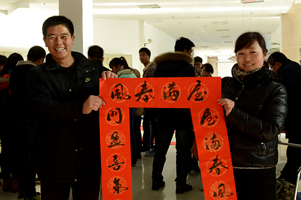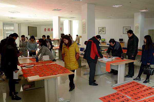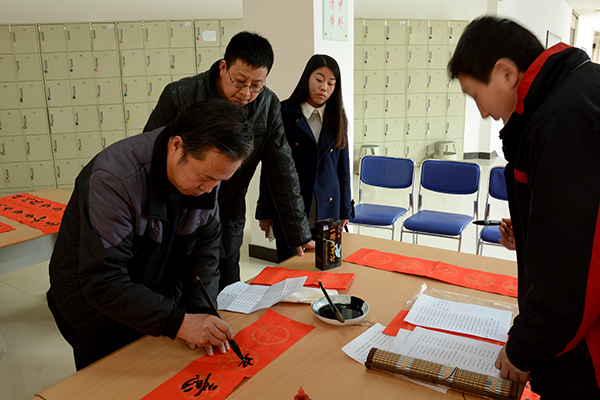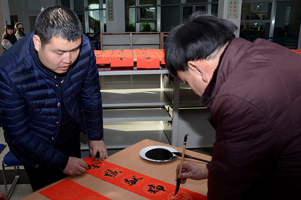 為了弘揚(yáng)中華民族傳統(tǒng)文化,豐富校園文化生活,營(yíng)造歡樂(lè)的節(jié)日氛圍,1月14日-15日,校工會(huì)聯(lián)合學(xué)校書(shū)法家協(xié)會(huì)舉辦了“迎新春 送春聯(lián)”活動(dòng)。我校書(shū)法家協(xié)會(huì)主席李尚民,書(shū)法家協(xié)會(huì)會(huì)員李中合、劉全民、王思根、黃新春、葉玉印、祁志華等在圖書(shū)館大廳鋪開(kāi)紅紙和筆墨,為師生們書(shū)寫(xiě)、贈(zèng)送春聯(lián)。