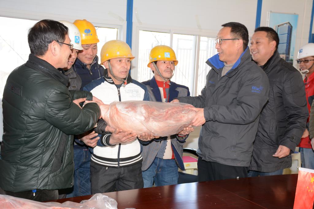 在座談會上,劉寶盈首先代表學校對參與我校項目建設的施工方工作人員的辛勤付出表示衷心感謝,在春節(jié)到來之際,對他們表示慰問,送上了大肉、花生等生活慰問品。他噓寒問暖,詳細地詢問工人們的工作、生活等方面的情況、工資的發(fā)放情況。在了解到工人們對各方面都感到滿意之后,表示很欣慰。最后,對參加我校基建項目建設的所有工作人員及其家庭致以春節(jié)的祝福。項目工作人員對學校的慰問表示衷心的感謝。