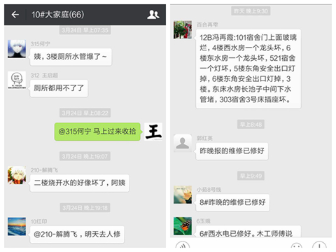 “阿姨,3樓廁所水管爆了。”“馬上過來收拾!”這是記者在“10#大家庭”微信群中看到的兩條留言。為了提高工作效率和學生宿舍管理工作的質量,從2015年起,我校開始嘗試“互聯網+”公寓管理新模式,搭建了公寓管理微信交流平臺。一年來,實現了1385個學生宿舍全面覆蓋,解決各類問題、矛盾近500起,為公寓管理工作插上了信息化的翅膀,并得到了在校學生、公寓管理工作者及學生工作者的一致好評。