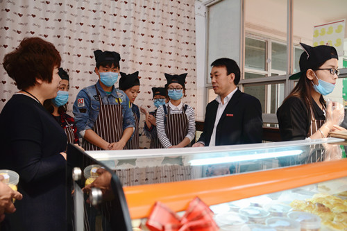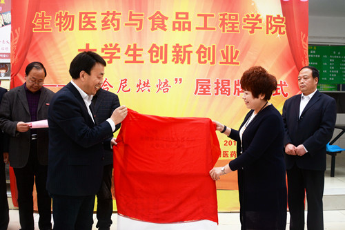 彭虎軍、金淑霞走進“哈尼烘焙”屋與師生交流,參觀制作流程,詢問項目運營情況,并鼓勵團隊成員積極探索、勇于創(chuàng)新。教務(wù)處、學(xué)生處、招生就業(yè)處、校團委、保衛(wèi)處、后勤保障處、生物醫(yī)藥與食品工程學(xué)院等單位相關(guān)負責(zé)人及“哈尼烘焙”屋創(chuàng)業(yè)團隊成員共同見證“哈尼烘焙”屋揭牌。