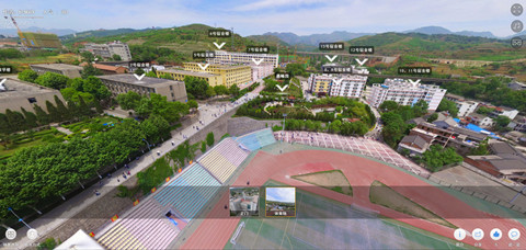 商洛學院720全景漫游系統分正門和體育場兩個場景。在正門的場景里,我們可以看到1、2、4、5、6號教學樓,1號宿舍樓,圖書館和體育場。頁面如下: