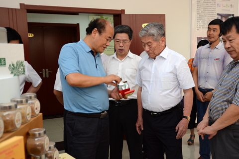 在植物學優勢學科展室,趙鵬大院士詳細了解了我校培育的小麥新品種和現代中藥產品,品嘗了我校開發的“商山養生紅”保健酒。他建議我校深入研究整理商洛區域土壤水質特性,有針對性地研發具有地域特色的良種和農藥、肥料等產品。