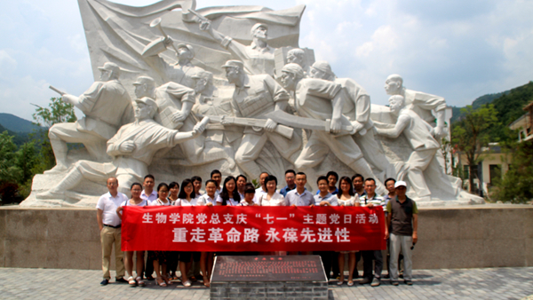 ——生物學院黨總支舉辦慶“七一”“重走革命路 永葆先進性” 活動。為慶祝中國共產黨建黨九十六周年華誕,6月29日,生物學院黨總支組織23名黨員赴商州區北寬坪鎮唐渠參觀商洛縣政府遺址、“中原突圍”紀念雕塑,開展“七一”主題活動,接受紅色革命再教育。活動期間,黨員們參觀了“中原突圍”紀念雕塑,重溫中原軍區沖破重重包圍,歷盡艱難,勝利地完成戰略轉移任務的革命事跡;隨后,參觀了商洛縣政府遺址,并舉行重溫入黨誓詞、合唱《沒有共產黨就沒有新中國》和黨的知識競答等活動。