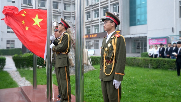 旗手們踏著矯健的步伐,莊嚴地護送五星紅旗走向升旗臺。在莊嚴嘹亮的國歌聲中,鮮艷的五星紅旗冉冉升起,全體人員肅立向國旗行注目禮,齊聲高唱國歌,為祖國母親獻上最真摯的祝福。