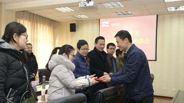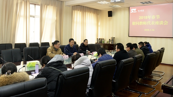 1月16日上午,我校召開2018年春節慰問教師代表座談會。副校長劉勇代表學校向與會教師送去了春節慰問和美好祝愿,向與會教師發放了春節慰問金。院長辦公室負責人參加座談。教務處處長李超主持座談。