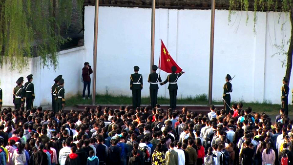 當雄壯激昂的國歌聲響起時,除參加升旗儀式的師生外,在操場訓練的運動員、為運動會開幕式排練大型節目的同學、早起晨練的師生3000余人也立即停止活動,原地肅立,向國旗行注目禮。場面蔚為壯觀。