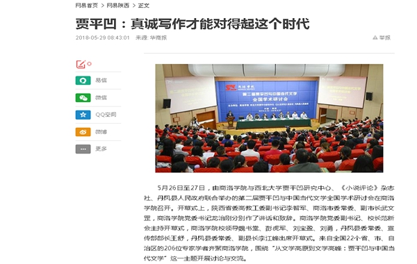 5月26日至27日,由我校與西北大學賈平凹研究中心、《小說評論》雜志社、丹鳳縣人民政府聯合舉辦的第二屆賈平凹與中國當代文學全國學術研討會在我校召開。來自全國22個省(直轄市、自治區)的200余位專家學者齊聚我校,同時還吸引了全國媒體記者的目光。人民網、光明網、中國社會科學網、中國作家網、搜狐網、陜西日報、陜西省教育廳網站、陜西網、文化藝術報、三秦網、三秦都市報、華商網、西北信息報、商洛日報、商洛市人民政府、商洛廣播電視臺、商洛新聞網等中央、省、市媒體和參會代表所在單位進行了報道,一些微信、微博等自媒體也紛紛報道和轉發。通過報道,賈平凹的文學世界進一步為更多讀者所了解,賈平凹的文學藝術進一步在更廣闊的空間傳播,積極促進了商洛乃至陜西文學事業的繁榮發展,擴大了我校的知名度和影響力。