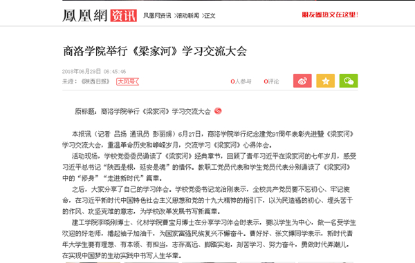 6月27日,我校召開(kāi)慶祝建黨97周年表彰先進(jìn)暨《梁家河》學(xué)習(xí)交流大會(huì),師生同臺(tái)深情誦讀《梁家河》經(jīng)典章節(jié),重溫革命歷史和崢嶸歲月,交流學(xué)習(xí)《梁家河》心得體會(huì),共聚一堂熱烈慶祝黨的生日。活動(dòng)舉辦后,《陜西日?qǐng)?bào)》、陜西省教育廳網(wǎng)站、陜西黨建網(wǎng)、中華誦網(wǎng)站、華商頭條、搜狐網(wǎng)、鳳凰網(wǎng)、三秦網(wǎng)、《商洛日?qǐng)?bào)》等媒體紛紛進(jìn)行報(bào)道,取得了良好的傳播效果,營(yíng)造了濃厚的《梁家河》學(xué)習(xí)宣傳氛圍。