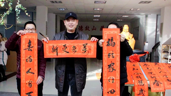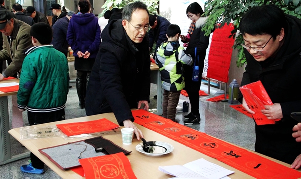 我校書法協會主席李尚民,書法協會會員劉勇、寇世珍、魏振中、陳玉柱、王威、李志超、李中合、張長林、祁志華、袁志正、劉宇昭等悉數到場,用濃墨“鴻國節,恭辭舊歲”,以重彩“錦福春,賀迎新年”。他們現場揮毫潑墨,為師生書寫春聯,展示書法的藝術魅力。