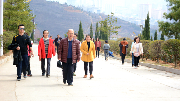 位于商洛市中心廣場北邊的金鳳山,有寬闊的水泥路和蜿蜒曲折的臺階通往山頂,參加活動的教職工們熱情高漲、意趣盎然,三五成群結伴而行,一邊呼吸著新鮮空氣,一邊飽覽自然美景,或大步流星拾級而上,或相互鼓勵穩步前行,一路灑下歡歌笑語。待到山頂極目遠眺,周邊風景盡收眼底,美麗的丹江宛若玉帶穿城而過,一幢幢高樓沿江林立,一條條公路向遠方延伸,春風伴著美景,令人心曠神怡,大家紛紛合影留念,定格快樂。