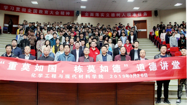 為進一步培育和踐行社會主義核心價值觀,大力學習宣傳道德模范和身邊好人的感人事跡,增強大學生思想道德教育實效性,3月26日,化材學院在圖書館二樓報告廳舉辦以“重莫如國 棟莫如德”為主題的道德講堂。化材學院師生400余人參加了活動。