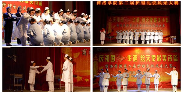 本次比賽項目包括護理禮儀風采展示和情景劇表演,其中護理禮儀主要包括護士容貌服飾、衣帽整理、行走姿式、站姿、坐姿、蹲姿、持病歷夾、端治療盤、推治療車、指示、握手等基本禮儀。比賽中,同學們隊形多樣,姿態優雅、舉止得體,劇本別出心裁,演技活靈活現,情節引人入勝,現場不時響起熱烈的掌聲。