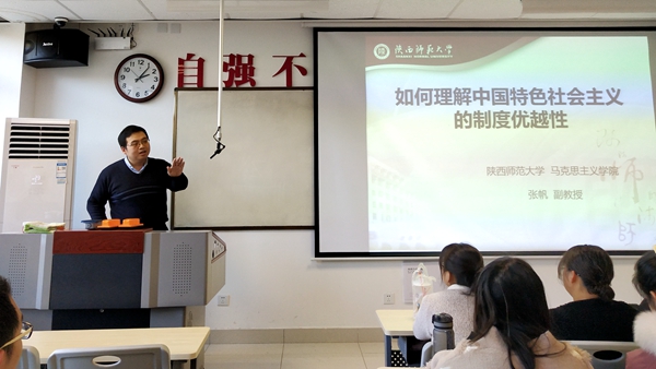 為深入學習黨的十九屆四中全會精神,促進思政課教學改革,提高課堂教學質(zhì)量。12月4日下午,我校特邀“陜西高校思政課教師大練兵”教學標兵、陜西師范大學副教授張帆來校,以《如何理解中國特色社會主義制度的優(yōu)越性》為題講述了一堂公開示范課。我校馬克思主義學院班子成員、全體教師及思政1801班學生聆聽了示范課。