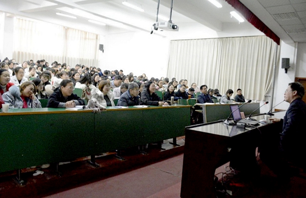 報告會上,曾大興對文學地理學這一新興學科進行了詳細介紹,并運用文學地理學的理論和方法對《九月九日憶山東兄弟》《江雪》《漁家傲》《江城子(乙卯正月二十日夜記夢)》等多篇古典詩歌經典作品進行了解讀。曾教授優雅的談吐,淵博的知識,風趣的語言,獲得了現場師生熱烈的掌聲。