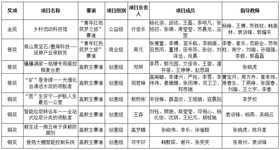 本屆大賽自今年6月啟動以來,我省共有106所學校報名參加,參賽項目突破4萬項,較去年增加近3000項,參賽學生突破18.4萬人次,較去年增加1.8萬,經校級初賽、網絡初審、會議評審、線上路演、評委會評審等環節后,最終產生金獎100項,單項獎7項。我?;膶W院學生付佳樂負責的《鄉村流動科技館》項目獲“青年紅色筑夢之旅”賽道金獎;化材學院學生周元負責的《商山黑寶石/墨烯科技---延伸產業保脫貧》項目獲得“青年紅色筑夢之旅”賽道銀獎;生物學院學生鄭妍負責的《穰穰滿家—桔梗專用緩控釋復合肥》項目、化材學院學生同若琳負責的《“礦”是奇緣——光催化自清潔水泥的領航者》項目獲得高教主賽道銀獎;健康管理學院學生殷煦彬負責的《“醫”生安寧--護航人生最后一公里》項目、生物學院學生高夢蝶負責的《鮮生活—南五味子保鮮防腐劑》項目、電信學院學生王森負責的《智能垃圾轉運車——全站式垃圾分類的領航者》項目、電信學院學生鄧宇環負責的《香菇大棚智能控制系統》項目獲得高教主賽道銅獎。