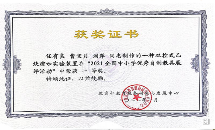近日,教育部教育裝備研究與發(fā)展中心舉辦了“2021全國中小學優(yōu)秀自制教具展評活動”,我校化學工程與現代材料學院教師任有良、曹寶月、劉萍的參展作品“一種雙控式乙炔演示實驗裝置”獲全國一等獎,任有良獲“全國自制教具能手”稱號。