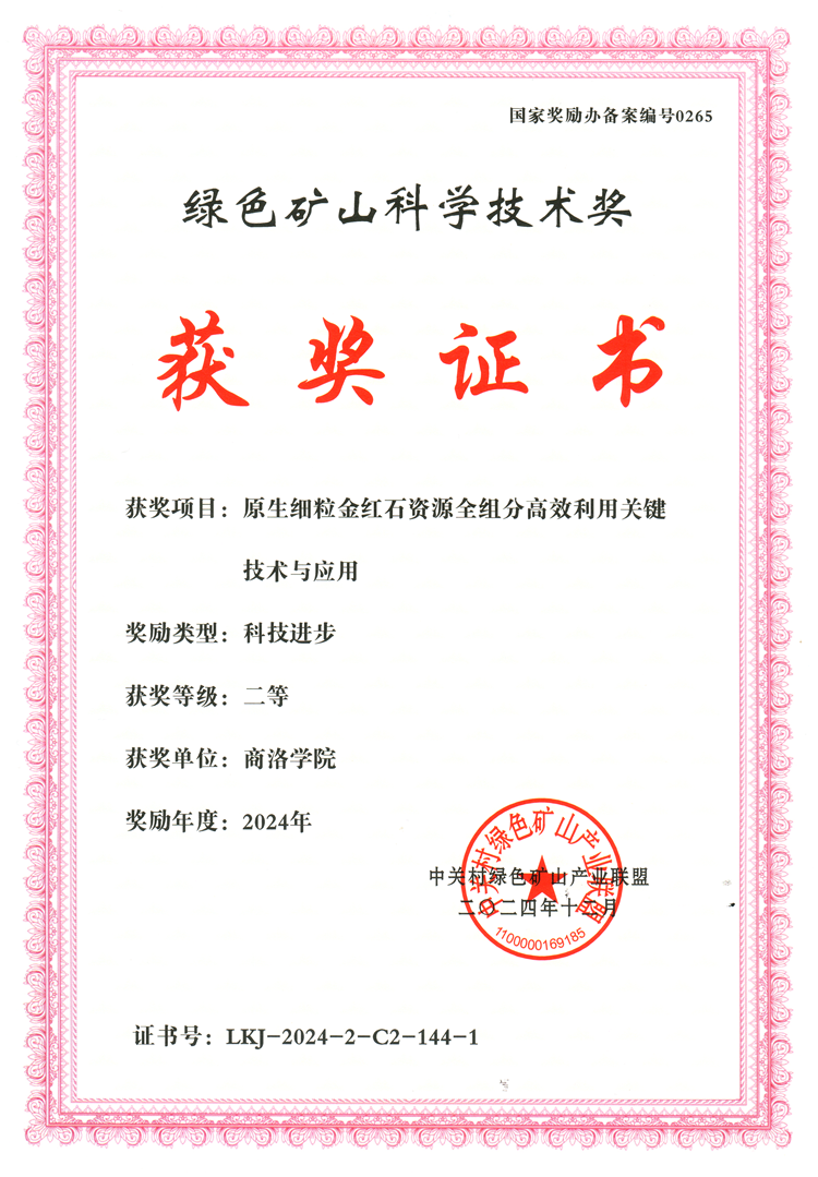 近日,第二屆中國綠色礦山國際年會暨2024年度綠色礦山科學技術獎頒獎大會在北京召開。我校化材學院劉明寶教授團隊申報的項目“原生細粒金紅石資源全組分高效利用關鍵技術與應用”喜獲2024年度綠色礦山科學技術獎科技進步二等獎。該成果是目前我校在綠色礦山建設領域獲得的最高獎項,也是團隊繼2023年度陜西省科技進步三等獎后的又一重要成果。
