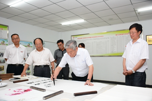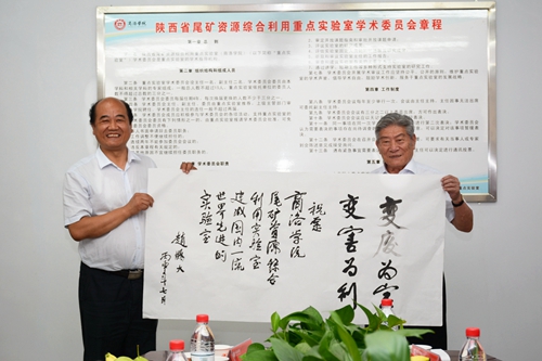 參觀時,趙鵬大院士親筆為重點實驗室題寫“變廢為寶,變害為利”,并祝愿我校尾礦資源綜合利用重點實驗室建成國內(nèi)一流、世界先進的實驗室。化材學(xué)院黨總支書記劉全民代表師生向趙鵬大院士贈送書法繪畫作品。