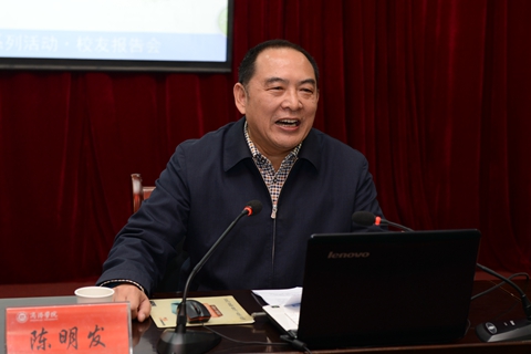 陳明發首先介紹了自己的名字與后來走上發明之路的淵源,指出發明有助于大學生創業、就業,鼓勵大家把發明作為興趣愛好來培養。他舉了三個例子說明了自己的發明之路:一是舉辦自己的發明展引起縣委書記的關注與支持;二是通過他人的幫助,到新的科技公司去打工、學習;三是收集各地項目,與企業家合作,重回海南辦公司。他十分感謝母校老師,表示是老師的幫助才使自己取得了創業的首次成功。