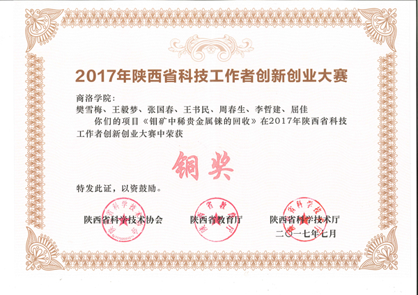 近日,由陜西省科協、陜西省教育廳、陜西省科技廳主辦的2017年陜西省科技工作者創新創業大賽在西安舉行,我校化材學院教師樊雪梅等7人共同申報的項目《鉬礦中稀貴金屬錸的回收》獲得大賽銅獎。這也是我校教師首次參加全省創新創業大賽并獲獎。