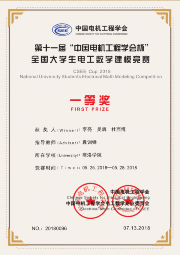 近日,中國電機(jī)工程學(xué)會電工數(shù)學(xué)專委會主辦的“第十一屆電工杯數(shù)學(xué)建模競賽”和江蘇省工業(yè)與數(shù)學(xué)應(yīng)用學(xué)會主辦的“第十五屆五一數(shù)學(xué)建模競賽”比賽結(jié)果揭曉,由我校學(xué)生李亮、吳凱、杜西博組成的參賽隊(duì)伍獲得第十一屆“電工杯”數(shù)學(xué)建模競賽一等獎(jiǎng),這是我校學(xué)生首次獲得電工杯數(shù)學(xué)建模競賽全國一等獎(jiǎng)。此外,我校參賽學(xué)生還在這兩個(gè)比賽中獲得國家級二等獎(jiǎng)2項(xiàng)、三等獎(jiǎng)6項(xiàng),省級二等獎(jiǎng)2項(xiàng)、三等獎(jiǎng)6項(xiàng)的好成績。