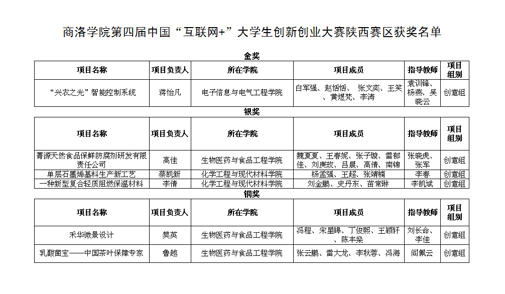 自2015年“互聯(lián)網(wǎng)+”大賽開展以來,我校把大賽作為應(yīng)用型人才培養(yǎng)的重要平臺,積極開展教學(xué)改革探索,把創(chuàng)新創(chuàng)業(yè)教育融入人才培養(yǎng),切實提高學(xué)生的創(chuàng)新精神、創(chuàng)業(yè)意識和創(chuàng)新創(chuàng)業(yè)能力。學(xué)校制定了《商洛學(xué)院學(xué)生創(chuàng)新創(chuàng)業(yè)教育實施方案》《商洛學(xué)院學(xué)生創(chuàng)新創(chuàng)業(yè)學(xué)分認(rèn)定辦法》,建立了由54名教師組成的校級創(chuàng)新創(chuàng)業(yè)教育專家?guī)欤ㄓ行<壓驮杭壉妱?chuàng)空間,培育、孵化創(chuàng)新創(chuàng)業(yè)項目,對先進(jìn)集體、優(yōu)勝團(tuán)隊及標(biāo)兵、優(yōu)秀指導(dǎo)教師等進(jìn)行表彰獎勵。為做好本屆大賽各項工作,我校成立了以校長為組長的校賽組委會,制定具體實施方案,鼓勵激勵廣大學(xué)生積極參加。針對288個參賽項目,學(xué)校聘請校外專家對項目負(fù)責(zé)人及指導(dǎo)教師進(jìn)行了多輪培訓(xùn),對項目精心打磨。經(jīng)過二級學(xué)院院內(nèi)賽和校內(nèi)預(yù)賽、初賽、決賽,評選出校級金獎10項、銀獎20項、銅獎30項。在暑假期間,教務(wù)處組織校級10項金獎項目負(fù)責(zé)人和指導(dǎo)教師進(jìn)行封閉訓(xùn)練,遴選9個項目代表學(xué)校參加陜西省復(fù)賽,最終6項獲獎。