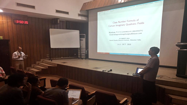 本次會議由29個報告、15次會議組成,其中1個主旨報告、7個大報告、13個邀請報告和8個交流報告。王念良教授應邀作了主題為《某些虛二次域上的類數公式》的報告,并主持了會議第二天的晚場報告及學術交流活動。