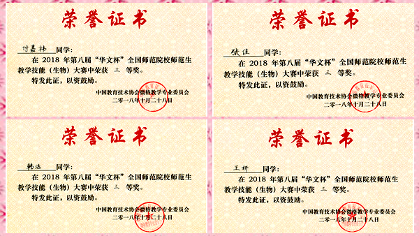 10月27日至28日, 2018年微格教學論壇暨第八屆“華文杯”全國師范院校師范生生物教學技能大賽在南京曉莊學院舉行。我校生物醫藥與食品工程學院生物科學專業2015級學生付嘉祎、韓潔、王妍、張佳參加大賽,并分別榮獲三等獎。