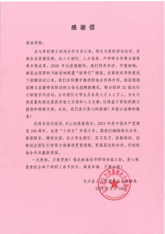春節前夕,浙江省湖州市長興縣向我校發來感謝信,高度肯定我校為當地人才招引和高質量趕超發展做出的積極貢獻,重申了與我校在抗擊疫情、復工復產中凝結的同舟共濟、守望相助的友好關系。希望與我校進一步擴展合作領域,提升合作層次,開創校地合作共贏新局面。