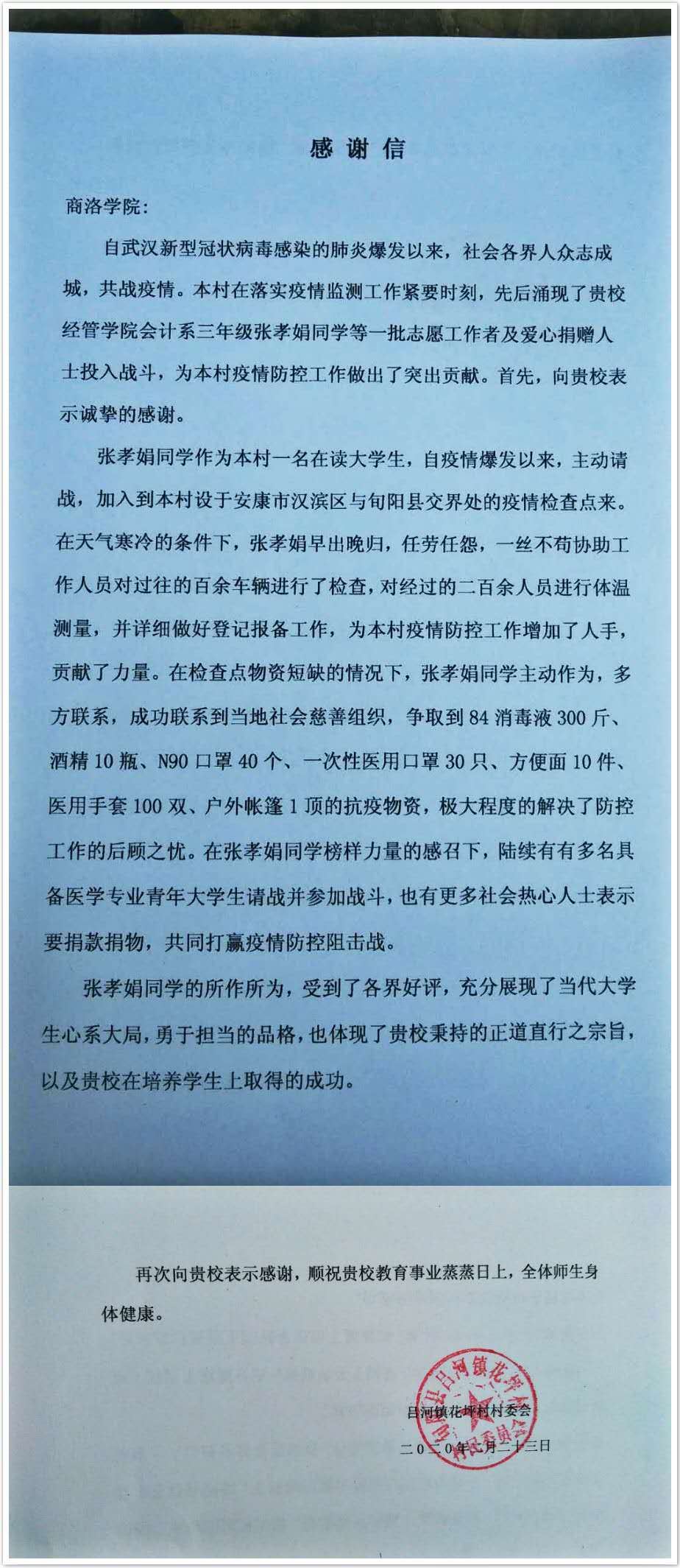 張孝娟同學的事跡受到鄉鎮領導、公安民警、村委會書記等人的一致好評,為對張孝娟同學本人以及商洛學院致謝,呂河鎮花坪村村委會專門向我校發來了感謝信。
