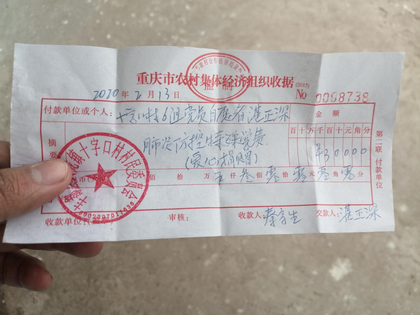疫情暴發時,湛正深同學正在重慶市豐都縣興龍鎮十字口村的老家,對疫情的關注格外用心的他,在得知村黨委需要志愿者后,第一時間到所在十字口村村黨委報到請戰,主動提交請戰書。他在請戰書中寫到:作為一名學生黨員,我時刻牢記著隨時準備為黨和人民犧牲一切的入黨誓詞,在疫情防控關鍵的時刻,希望能夠參與到疫情防疫第一線,為防范疫情出一份力。同時,湛正深還將自己兼職賺取的三百元現金作為特殊黨費上交組織以做疫情防控之用。經過當地黨委的批準,湛正深同學加入“抗疫”工作小組,在做好自身安全防護的前提下,迅速投身防控一線。