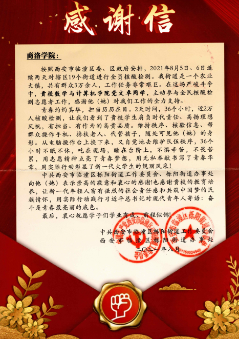 近日,中共西安市臨潼區櫟陽街道工作委員會、街道辦事處向我校發來感謝信。信中熱情贊揚了我校學生黨文卓在櫟陽街道全民核酸檢測志愿服務工作中所作出的貢獻,同時對我校教育培養優秀學生表示誠摯感謝。
