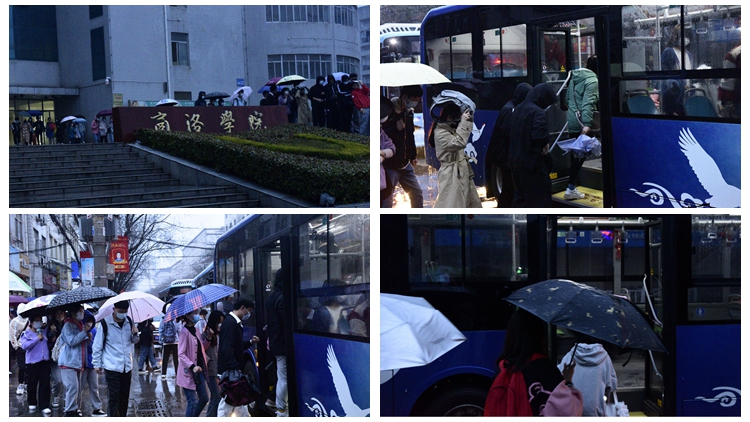 3月12日上午6:20分,學校調集的16輛公交車輛準時到達北新街校區和丹江校區大門前。相關輔導員與帶隊教師逐一查驗考生行程碼、健康碼,提醒學生帶好健康檢測報告及身份證、準考證,專人帶隊跟車,將考生運送至商洛職業技術學院與商洛市初級中學兩個考點。學生在考試后通過“綠色通道”用餐,所有科目考試完畢后再乘車返校。通過分考點、分時段、分類別、分批次“點對點”的轉運方式,全天累計出動87車(次),確保全體考生圓滿完成考試工作。
