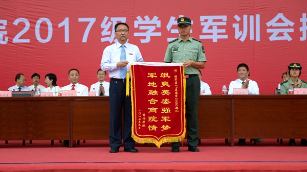 為感謝軍訓團教官對我校學生的悉心指導,黨委書記龍治剛代表學校向第77集團軍某部贈送了寫有“颯爽英姿強軍夢 軍地融合商院情”的錦旗,馬防少校代表全體教官接受了錦旗。