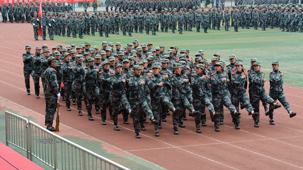 分列式結束后,我校學生進行了花樣隊列、女子防身術、捕俘拳、捕俘刀、突擊演練與戰地救護、韻律操等匯報表演。伴隨著悠揚的旋律,女兵們擺出了巨大的“中國”“喜迎十九大”等造型,祝福黨的十九大勝利召開。由男兵們表演的捕俘拳動作精煉、氣勢磅礴,贏得了現場陣陣熱烈的掌聲。突擊演練與戰地救護展示了戰術手語、戰術隊形和破襲戰斗等,同學們配合密切、組織嚴謹,展示了良好的戰斗技能和戰術素養,將現場氣氛推向了高潮。
