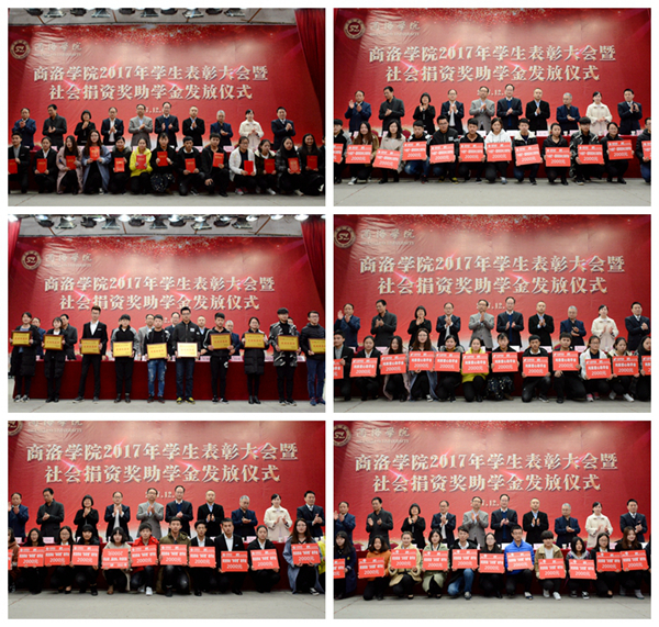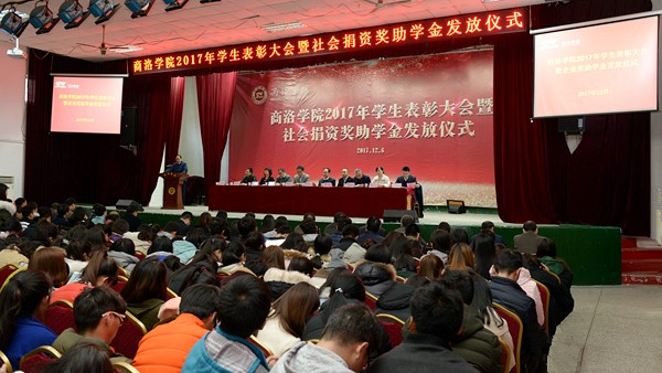 大會對2016-2017學年先進班集體、十佳大學生、三好學生、優秀學生干部、文明大學生、2017年暑期“三下鄉”社會實踐暨扶貧攻堅專項活動優秀團隊及先進個人、優秀團隊,商洛學院第八屆“挑戰杯”課外學術活動作品競賽及大學生創業計劃大賽優秀團隊和先進個人代表進行了表彰,向200名受獎受助學生發放了社會捐資獎助學金。