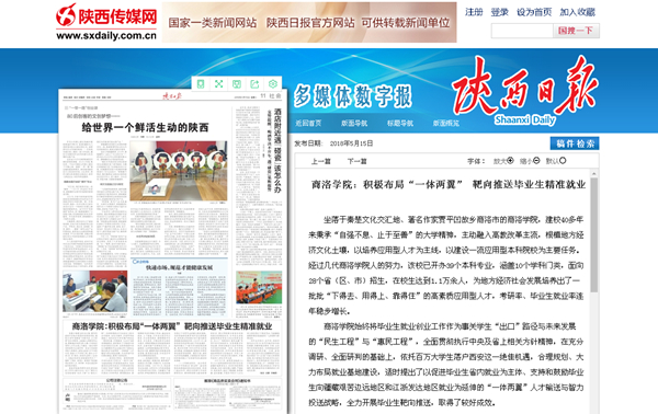 5月15日,《陜西日報》第11版以《商洛學院:積極布局“一體兩翼” 靶向推送畢業生精準就業》為題,對我校就業工作進行了專題報道。