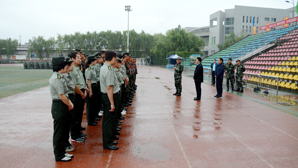 9月18日,武警陜西省總隊副參謀長連文生大校、武警商洛支隊支隊長王平上校、武警商洛支隊政委梁棟上校一行冒雨來我校視察慰問承訓教官與參訓師生。黨委副書記彭虎軍陪同檢查。