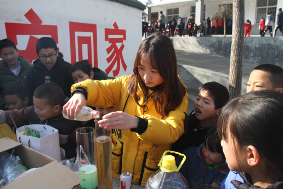 過程艱辛,但堅持總會成功。作為鄉村流動科技館項目負責人,我深知自己的責任和使命。記得之前有朋友問我說:“你大學四年的時光都投入在了這一件事情上,難道就沒想過放棄嗎?”我給她的回答是:“當然有過!在我大冬天為了清洗實驗儀器手被凍得僵硬和通紅的時候;在我因為天冷提前準備的小實驗現象久久出不來,我手足無措的時候;在我因為長時間坐車而嚴重暈車的時候,我就默默告訴自己下次一定不來了。可是當我做實驗展演時,看到臺下小朋友們誠摯的眼神,我又看到了自己做這件事情的意義,看到了這項筑夢活動的初衷。”為了讓更多的鄉村中、小學、幼兒園學生接觸到科普教育資源的最初的夢想,不止是我一個人的,團隊里每一個熱愛科技制作,樂于奉獻的年輕人,他們用實際行動證明了對這項工作的熱愛。