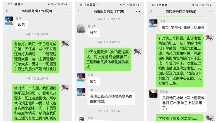 ——靈活調配,“疫”往無前。除保障校內教職工必需的生活物資,便民服務隊還積極協助師生解決疫情期間的其他問題。4月12日,一位教師家中煤氣耗盡,便民服務隊多方聯絡,及時為他送去新的煤氣罐,以解“燃眉之急”。在疫情防控應急處置期間,學校前后進行6輪全員核酸檢測。便民志愿服務隊隊員的工作時間大多集中在中午或下午,得知上午全員核酸檢測服務人手不足的情況,隊員們又主動加入核酸檢測志愿服務隊伍,為抗擊疫情多貢獻一份力量。