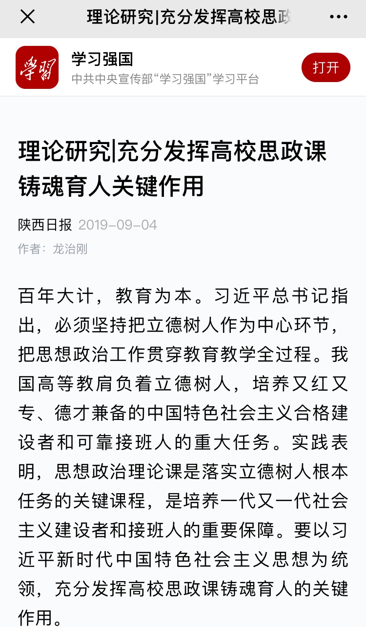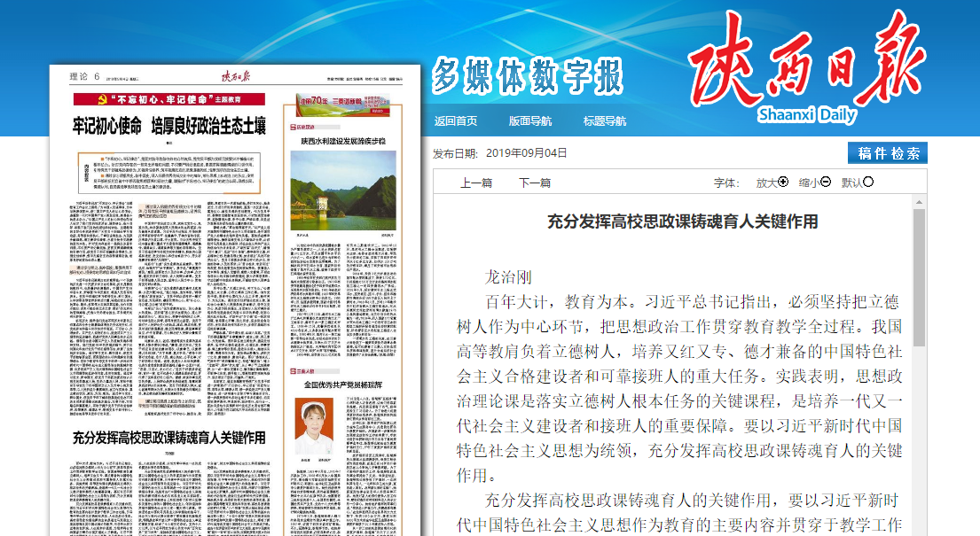 黨委書記龍治剛在《陜西日報》2019年9月4日第6版發表理論文章《充分發揮高校思政課鑄魂育人關鍵作用》,學習強國平臺全文轉載。文章內容如下: