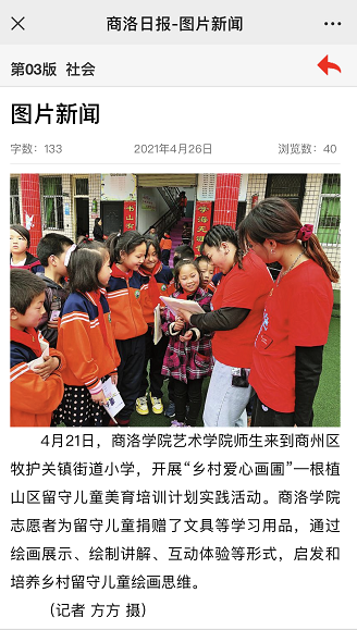 4月26日,商洛日報三版社會版面對我校承擔(dān)的公益項目“鄉(xiāng)村愛心畫圃”走進商州區(qū)牧戶關(guān)街道小學(xué)開展公益活動進行了報道,原文如下: