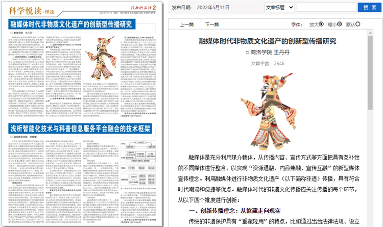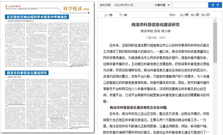 5月份以來,我校教師袁訓鋒、田祎、王丹丹先后在《陜西科技報》理論版刊發《垃圾分類促進秦嶺生態保護與提升公民科學素質實踐研究》《商洛市科普信息化建設研究》《融媒體時代非物質文化遺產的創新型傳播研究》三篇文章,圍繞秦嶺生態保護、科普信息化建設、非物質遺產創新傳播等主題,介紹我校科研服務地方實踐成果和經驗。文章主要內容如下:
