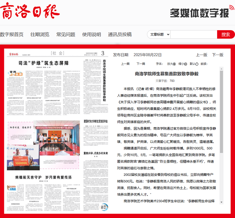 商洛籍青年李靜毅渭河救人不幸犧牲的感人事跡經(jīng)媒體報(bào)道后,在商洛學(xué)院師生中引起廣泛反響。該校發(fā)出《關(guān)于深入學(xué)習(xí)李靜毅同志崇高精神暨開展愛心捐贈的倡議書》,師生積極響應(yīng),短時間內(nèi)募集愛心捐款2.4萬多元。8月19日,該校相關(guān)領(lǐng)導(dǎo)赴商州區(qū)金陵寺鎮(zhèn)崔坪村將善款送至李靜毅父母手中,傳遞全校師生對英雄家庭的關(guān)懷。