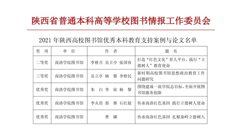 由陜西省高校圖工委主辦的“2021年陜西高校圖書館本科教育支持案例與論文大賽”結果于日前揭曉,圖書館館員李秋月獲二等獎,員立亭獲三等獎,朱白、李火苗和曹娜等人獲優秀獎。